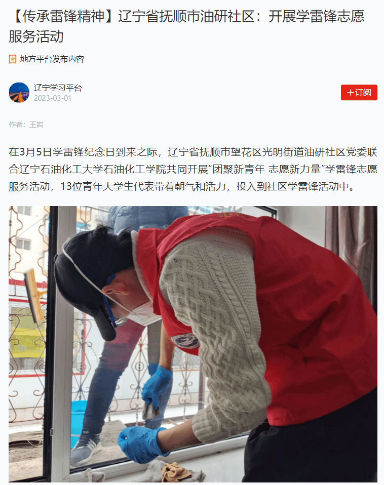 编者按:近日,学习强国辽宁学习平台对我校石油化工学院与抚顺市油研社区共同开展“团聚新青年 志愿新力量”学雷锋志愿服务活动进行了宣传报道。现将相关报道转载如下: