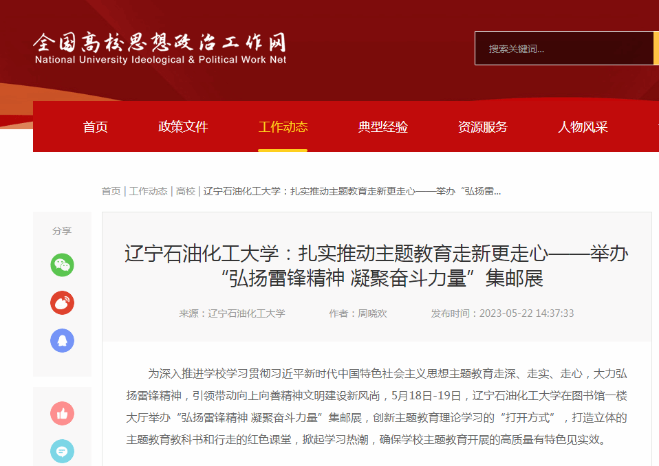 编者按:近日,全国高校思想政治工作网、抚顺电视台、辽宁日报·北国号等媒体平台对我校在图书馆一楼大厅举办“弘扬雷锋精神 凝聚奋斗力量”集邮展,创新主题教育理论学习的“打开方式”,打造立体的主题教育教科书和行走的红色课堂,掀起学习热潮,确保学校主题教育开展的高质量有特色见实效进行了宣传报道。现将相关报道转载如下: