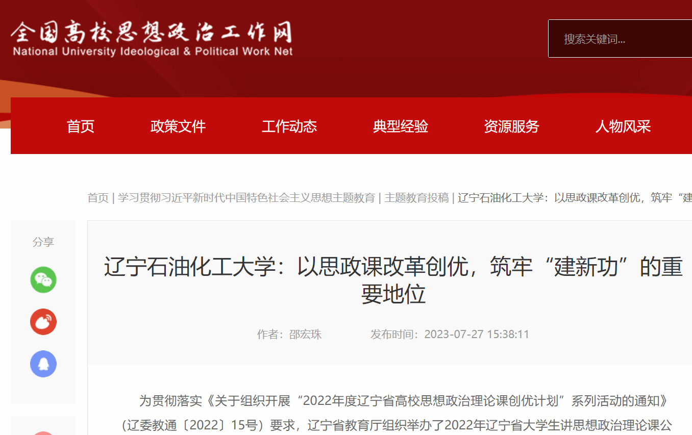 编者按:近日,全国高校思想政治工作网对我校马克思主义学院以思政课改革创优,筑牢“建新功”的重要地位,在辽宁省大学生讲思想政治理论课公开课展示活动中获奖进行了宣传报道。现将相关报道转载如下: