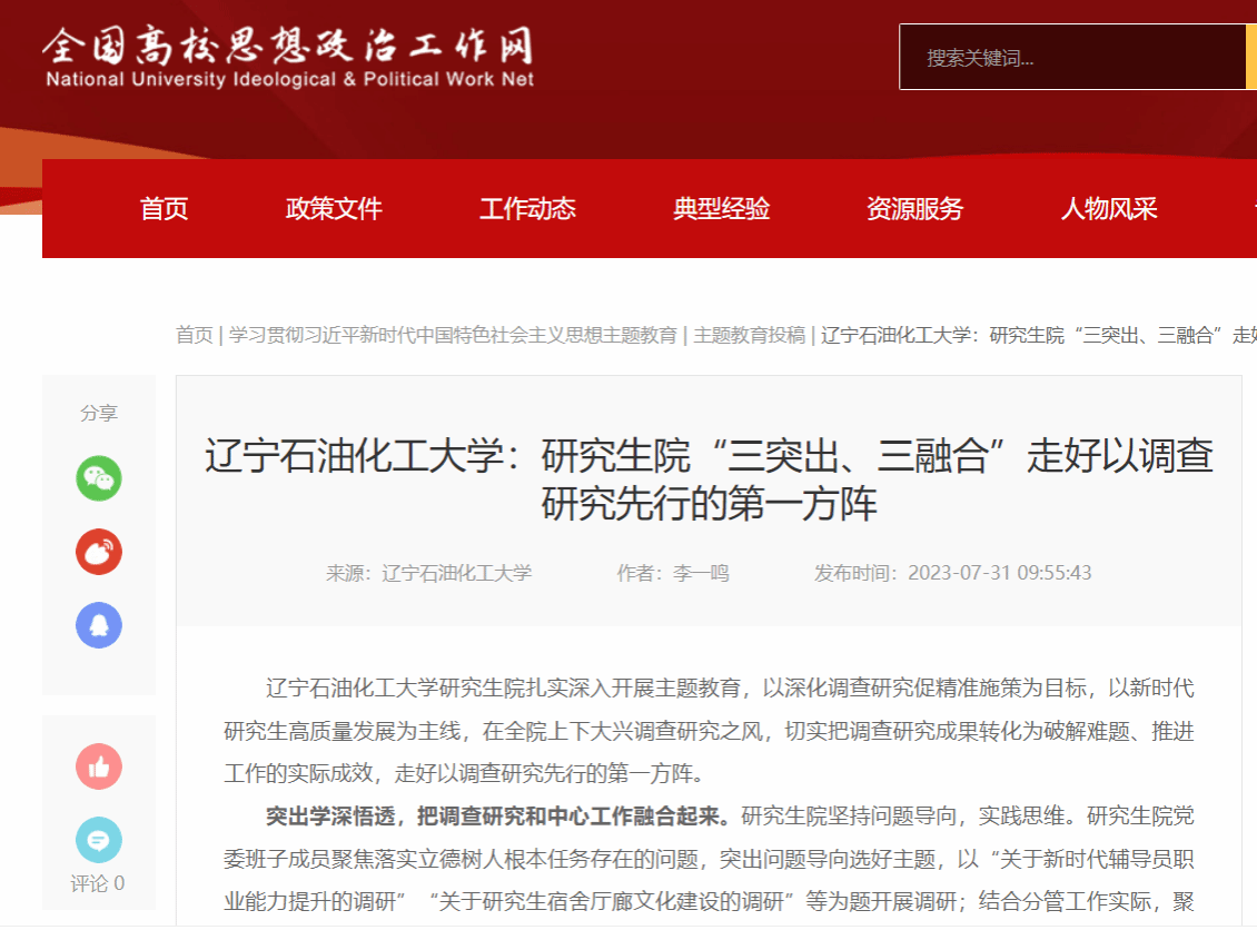 编者按:近日,全国高校思想政治工作网对我校研究生院扎实深入开展主题教育,以深化调查研究促精准施策为目标,以新时代研究生高质量发展为主线,在全院上下大兴调查研究之风,切实把调查研究成果转化为破解难题、推进工作的实际成效,走好以调查研究先行的第一方阵进行了宣传报道。现将相关报道转载如下: