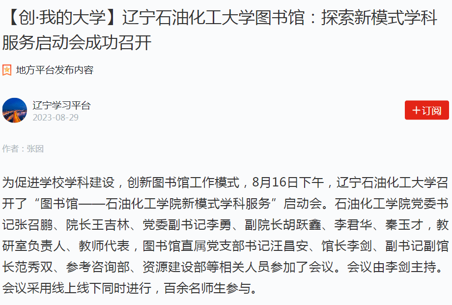 编者按:近日,学习强国辽宁学习平台对我校召开“图书馆——石油化工学院新模式学科服务”启动会进行了宣传报道。现将相关报道转载如下: