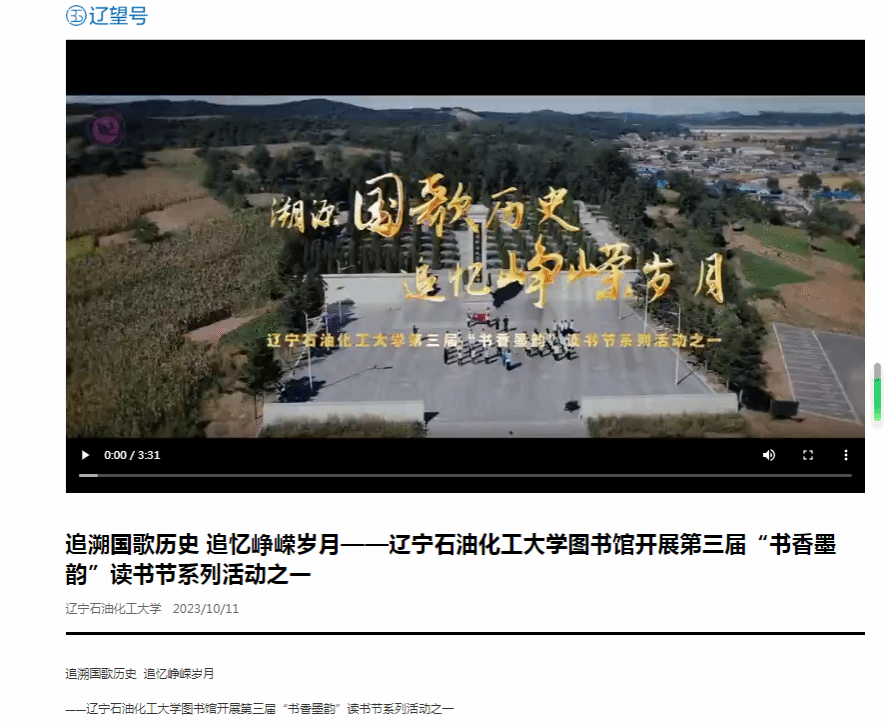 编者按:近日,人民日报客户端·人民号、辽宁日报·辽望号对我校开展的第三届“书香墨韵”读书节系列活动之“溯源国歌历史,追忆峥嵘岁月”活动进行了宣传报道。现将相关报道转载如下: