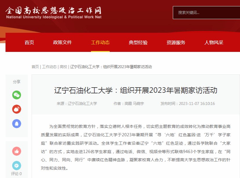 编者按:近日,全国高校思想政治工作网、辽宁高校思政微信公众号对2023年暑期我校开展“寻‘六地’红色基因·进‘万千’学子家庭”联合家访暨实践研学活动,全体学生工作者沿着辽宁“六地”红色足迹,通过各学院联合“大家访”的方式,实地走进126名学生家庭,通过电话、微信、视频会等形式联络9463个学生家庭,在“同心、同力、同向、同行”中赓续红色精神血脉,凝聚家校育人合力,不断提高大学生思想政治工作的针对性和实效性进行了宣传报道。现将相关报道转载如下: