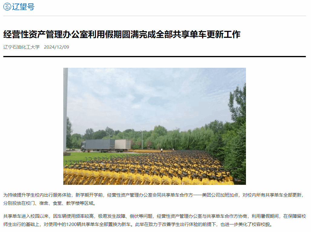 编者按:为持续提升学生校内出行服务体验,新学期开学前,经营性资产管理办公室会同共享单车合作方一一美团公司加班加点,对校内所有共享单车全部更新,分别投放在校门、宿舍、食堂、教学楼等区域。辽宁日报•辽望号对此进行了宣传报道。现将相关报道转载如下: