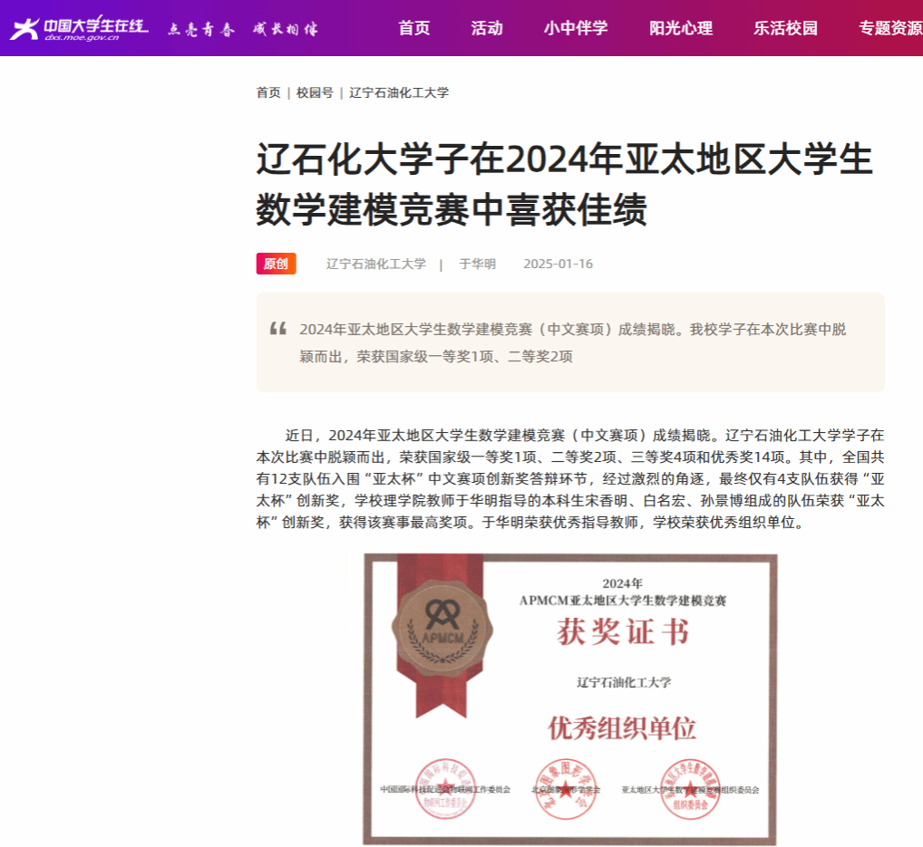 教育部中国大学生在线网:辽石化大学子在2024年亚太地区大学生数学建模竞赛中喜获佳绩
