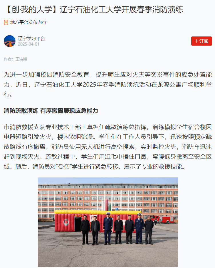 编者按:为进一步加强校园消防安全教育,提升师生应对火灾等突发事件的应急处置能力,近日,学校2025年春季消防演练活动在龙源公寓广场顺利举行。学习强国辽宁学习平台对此进行了宣传报道。现将相关报道转载如下:
