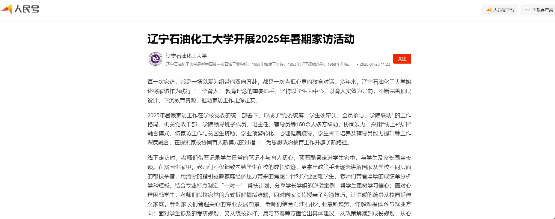 编者按:学校2025年暑假家访工作在学校党委的统一部署下,形成了“党委统筹、学生处牵头、全员参与、学院联动” 的工作格局。人民日报客户端·人民号、辽宁日报·辽望号、搜狐号等媒体平台对学校开展的2025年暑期家访活动进行了宣传报道。现将相关报道转载如下: