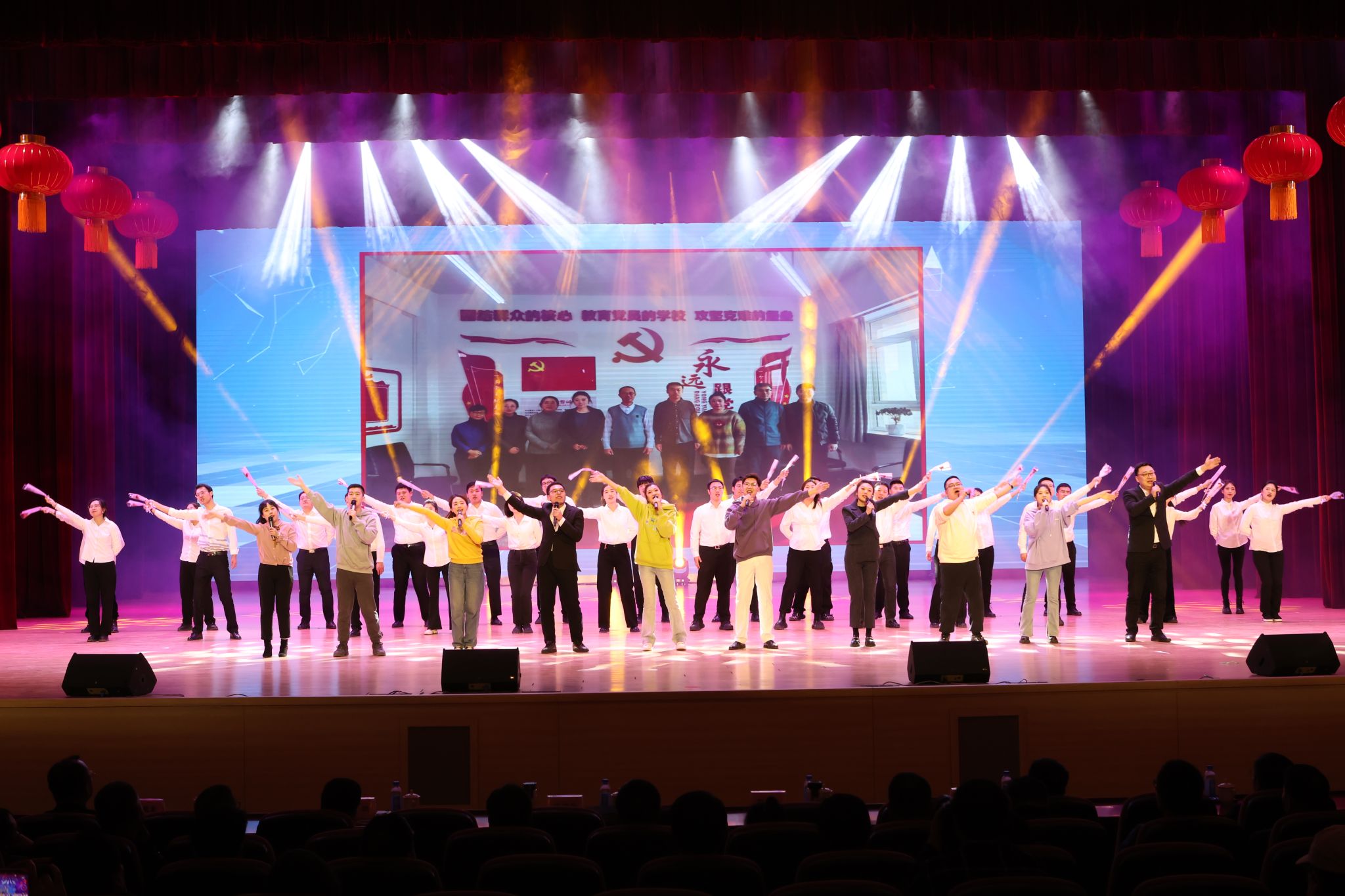 十大新闻发布后,由学校工会组织筹备、师生自编自演的十个精彩文艺节目将颁奖典礼的气氛再次点燃,颁奖典礼在《我们走在大路上》的乐曲声中圆满礼成。